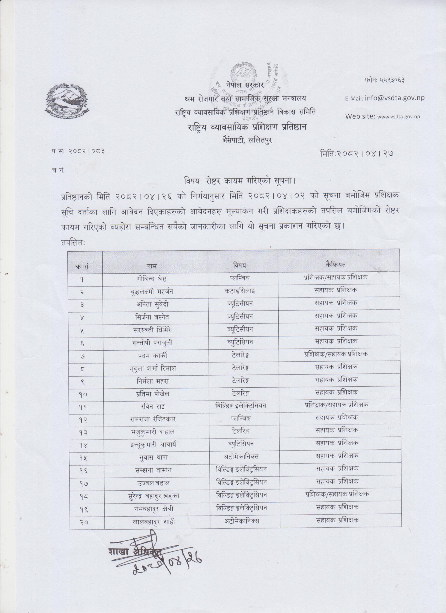 आ.व. २०८२/०८३ को प्रशिक्षक/सहायक प्रशिक्षकको रोष्टर कायम गरिएको सूचना