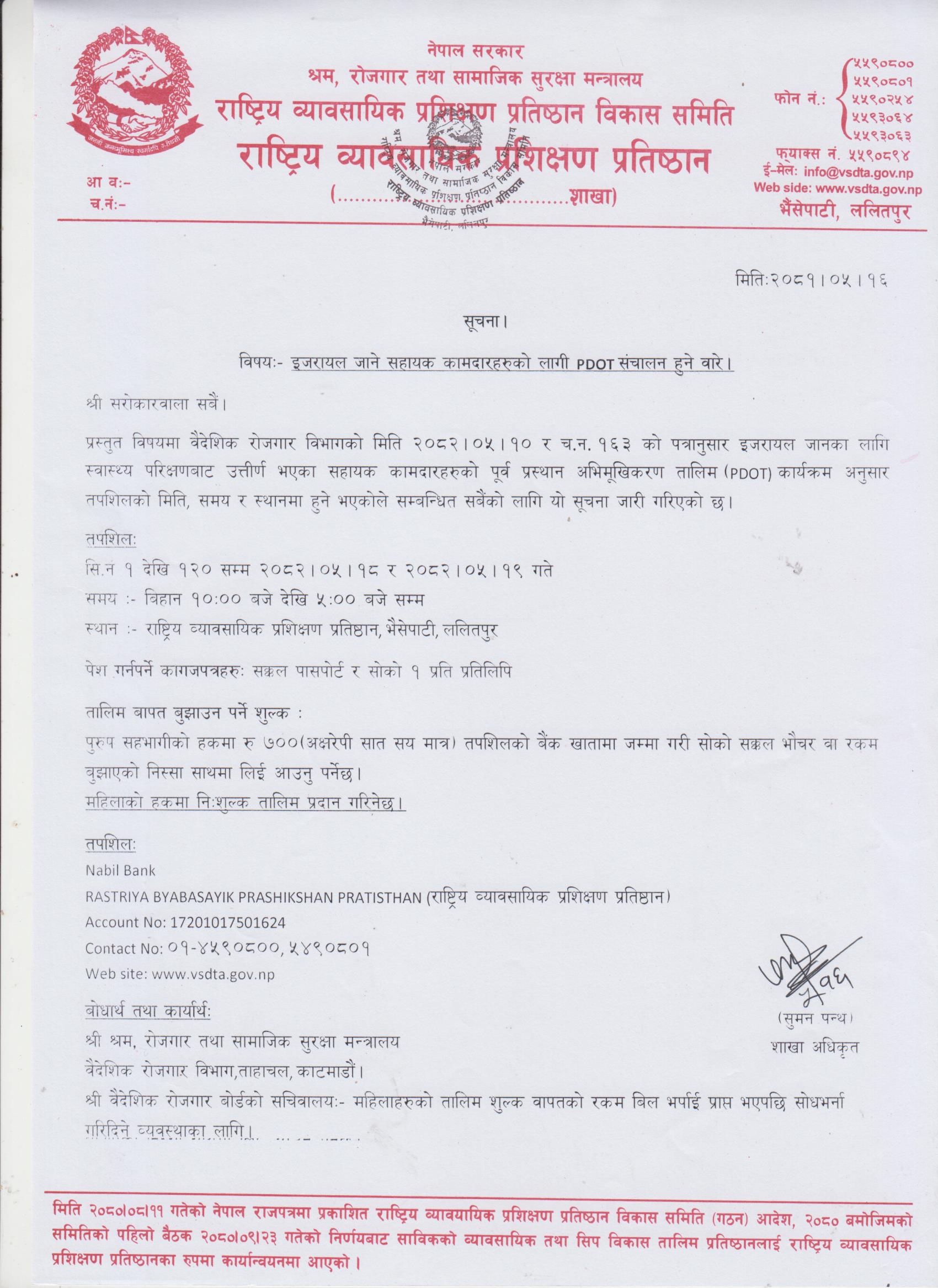 इजरायल जाने सहायक कामदारहरुको लागि PDOT संचालन सम्वन्धी सूचना