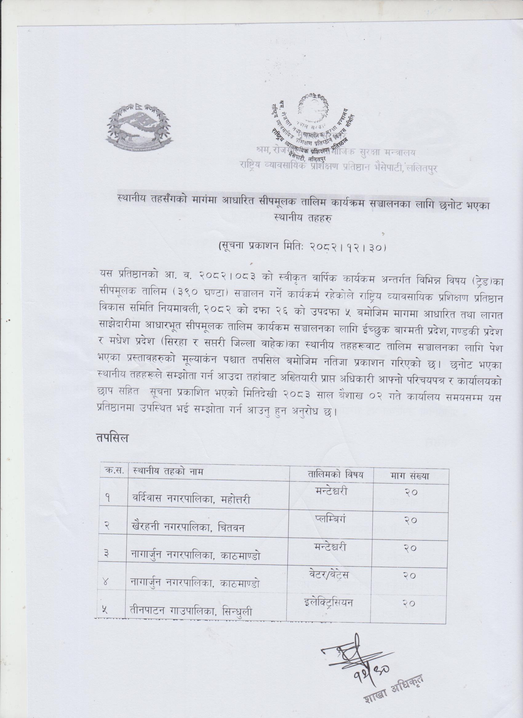 स्थानीय तहसंग लागत साझेदारीमा आधारभूत सीपमूलक तालिम संचालन गर्नको लागि पुन : निवेदन आव्हान सम्वन्धी सूचना